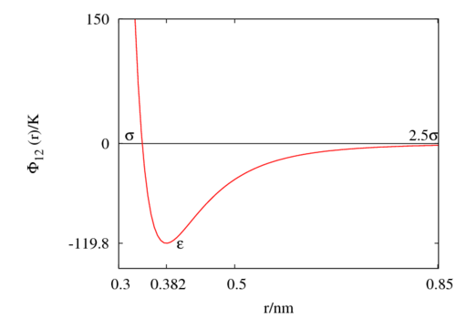 The Lennard-Jones model is often used with a cutoff radius of Failed to parse (SVG (MathML can be enabled via browser plugin): Invalid response ("Math extension cannot connect to Restbase.") from server "https://wikimedia.org/api/rest_v1/":): {\displaystyle 2.5 \sigma} , beyond which Failed to parse (SVG (MathML can be enabled via browser plugin): Invalid response ("Math extension cannot connect to Restbase.") from server "https://wikimedia.org/api/rest_v1/":): {\displaystyle \Phi_{12}(r)} is set to zero. Setting the well depth to be 1 in the potential on arrives at Failed to parse (SVG (MathML can be enabled via browser plugin): Invalid response ("Math extension cannot connect to Restbase.") from server "https://wikimedia.org/api/rest_v1/":): {\displaystyle \Phi_{12}(r)\simeq -0.0163} , i.e. at this distance the potential is at less than 2% of the well depth. For an analysis of the effect of this cutoff on the melting line see the work of Mastny and de Pablo [12] and of Ahmed and Sadus [23]. See Panagiotopoulos for critical parameters [24]. See Pártay for the ground state structure [25]. It has recently been suggested that a truncated and shifted force cutoff of Failed to parse (SVG (MathML can be enabled via browser plugin): Invalid response ("Math extension cannot connect to Restbase.") from server "https://wikimedia.org/api/rest_v1/":): {\displaystyle 1.5 \sigma} can be used under certain conditions [26]. In order to avoid any discontinuity, a piecewise continuous version, known as the modified Lennard-Jones model, was developed.