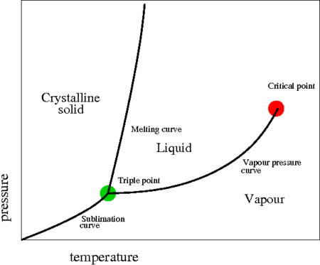 The following is a schematic phase diagram of a monatomic substance in the temperature-pressure plane. It shows the vapour and liquid phases, as well as the crystalline solid phase. The critical point is highlighted by a red spot, and the green spot represents the triple point.