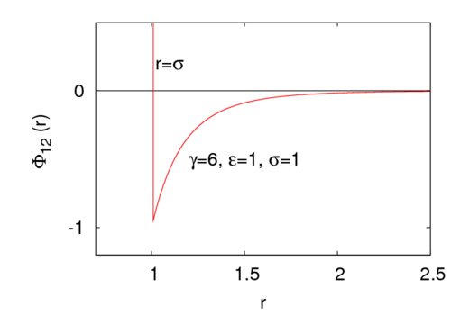 where is the intermolecular pair potential, is the distance between site 1 and site 2, is the radius of the central hard core, is the energy well depth (), and is a parameter that controls the interaction range. For example, for the potential look like