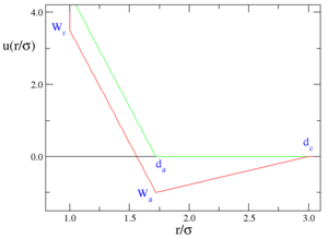 - Failed to parse (SVG (MathML can be enabled via browser plugin): Invalid response ("Math extension cannot connect to Restbase.") from server "https://wikimedia.org/api/rest_v1/":): {\displaystyle u(r) = \left\{ \begin{array}{ll} \infty & {\rm if} \; r < \sigma \\ W_r - (W_r-W_a) \frac{r-\sigma}{d_a-\sigma} & {\rm if} \; \sigma \leq r \leq d_a \\ W_a - W_a \frac{r-d_a}{d_c-d_a} & {\rm if} \; d_a < r \leq d_c \\ 0 & {\rm if} \; r > d_c \end{array} \right. }