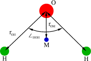 | | | <math>r_{\mathrm {OH}}</math> (Å)|| <math>\angle</math>HOH , deg|| <math>\sigma</math> (Å)|| <math>\epsilon/k</math> (K)|| q(O) (e) || q(H) (e) || q(M) (e) || <math>r_{\mathrm {OM}}</math> (Å) | ||