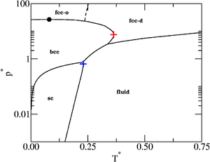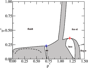 The phase diagram of anisotropic particles (also known as patchy particles) that have octahedral symmetry [1]. The octahedral symmetry is achieved via six attractive patches.